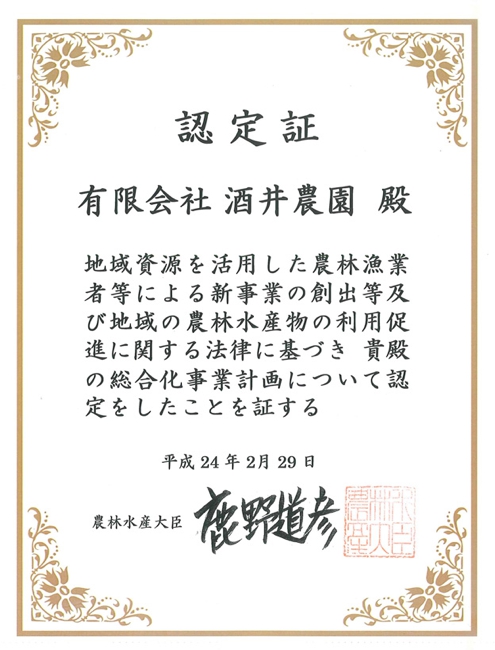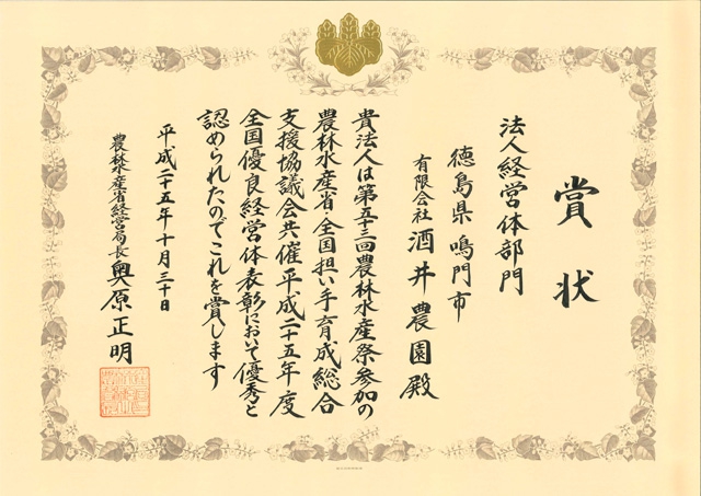徳島県知事認定エコファーマー(徳島県知事認定第一号)